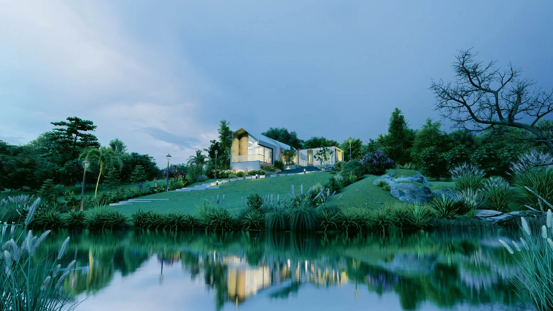 The entire house is decorated with a sprawling lawn in front with vegetation on the periphery. The lawn descends down towards the breathtaking backwaters, letting the user escape into a dream world